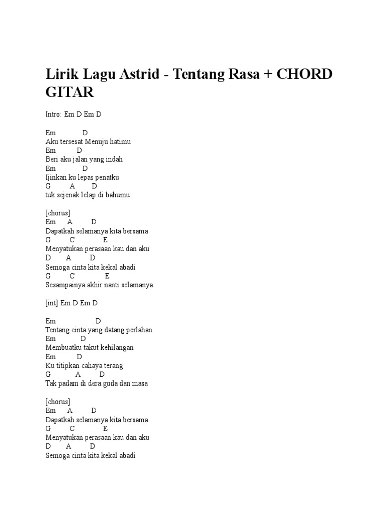 Posted by lirik lagu at 1045 AM 0 comments. Semoga cinta kita kekal abadi. Chord Astrid Tentang Rasa - intro Em D Em D Em D Aku tersesat Menuju hatimu Em D Beri aku jalan yang indah Em D Ijinkan ku lepas penatku G A D tuk sejenak lelap di bahumu chorus Em A D Dapatkah selamanya kita bersama G C E Menyatukan perasaan kau dan aku D A D Semoga cinta kita kekal abadi G C E Sesampainya akhir nanti selamanya int Em D Em D Em D Tentang cinta.